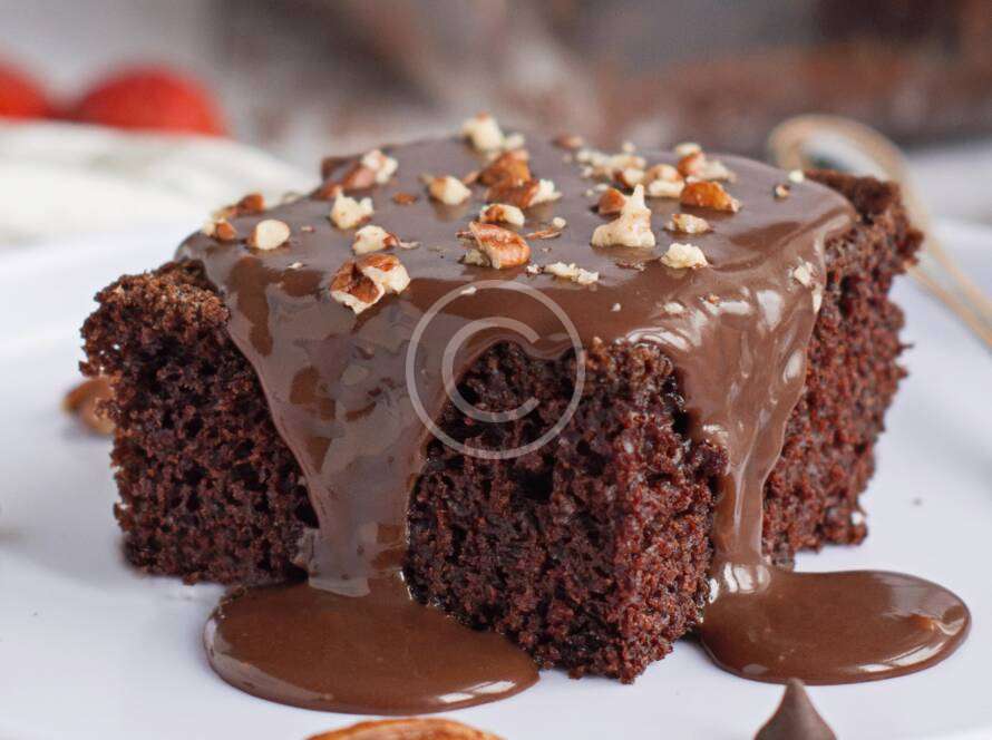 Soft sponge cake with dark chocolate topping and nuts